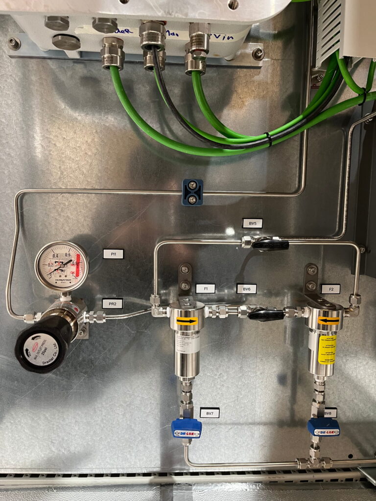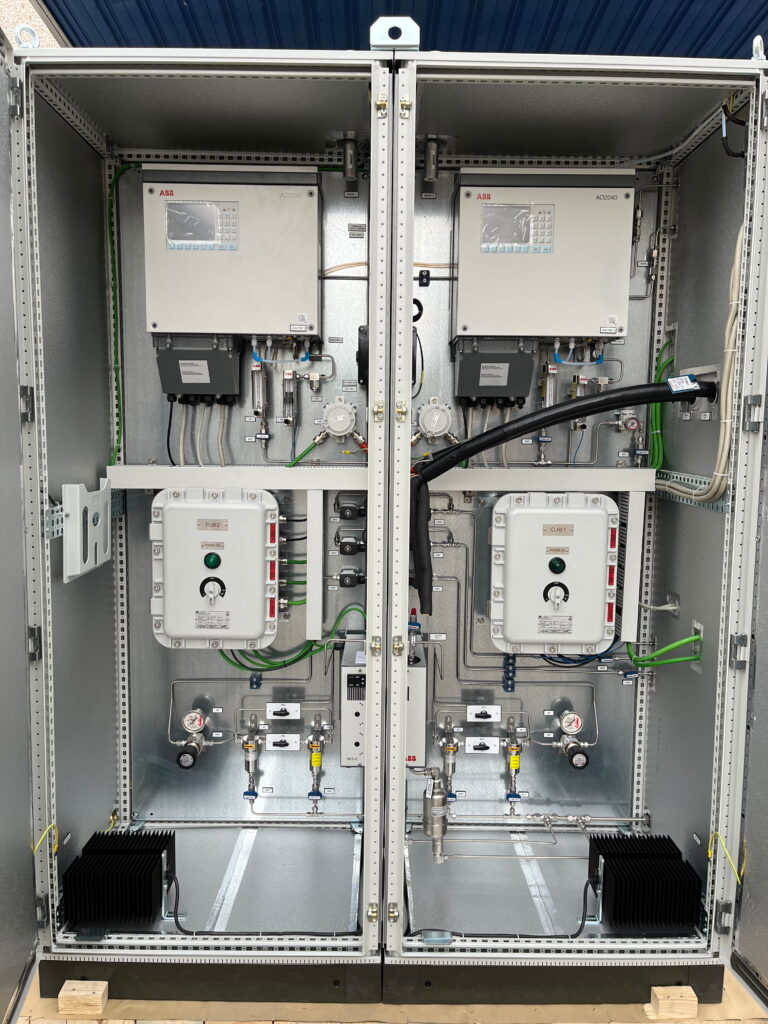 En este proyecto, se ha empleado una envolvente doble de acero inoxidable con refrigeración redundante por sistema Vortex mediante aire comprimido, para cumplir con normativa ATEX. Asimismo, todo el conexionado interior de los diferentes elementos de acondicionamiento de muestra (todos ellos ATEX) es con tubing de acero inoxidable. La medida de Hidrógeno es con analizadores de conductividad térmica